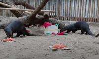 Crudità di pesce d’acqua dolce per il pranzo del primo dell’anno di Felipe e Apalai, le uniche due lontre giganti d’Italia che vivono al Parco Natura Viva di Bussolengo: trota tagliata a dadini e latterini nelle due torte pronte da mangiare, filetti di trota negli scatoloni da rovesciare e cercare di aprire per sbafarne il contenuto. Assente tuttavia il lavarello, il pesce che più di tutti amano mangiare. Un inizio di 2021 come si deve dunque, per i due inseparabili fratelli di dieci e otto anni arrivati per la prima volta nel nostro Paese poco più di un anno fa da un parco zoologico spagnolo. Minacciati di estinzione, appartengono alla più grande tra le 13 specie di lontra esistenti, vessata in passato dalla caccia per la pelliccia e che oggi rischia di scomparire a causa dell’inquinamento e della degradazione dei sistemi fluviali sudamericani in cui abita. In Europa, il programma di conservazione della specie ospita in totale 72 individui.