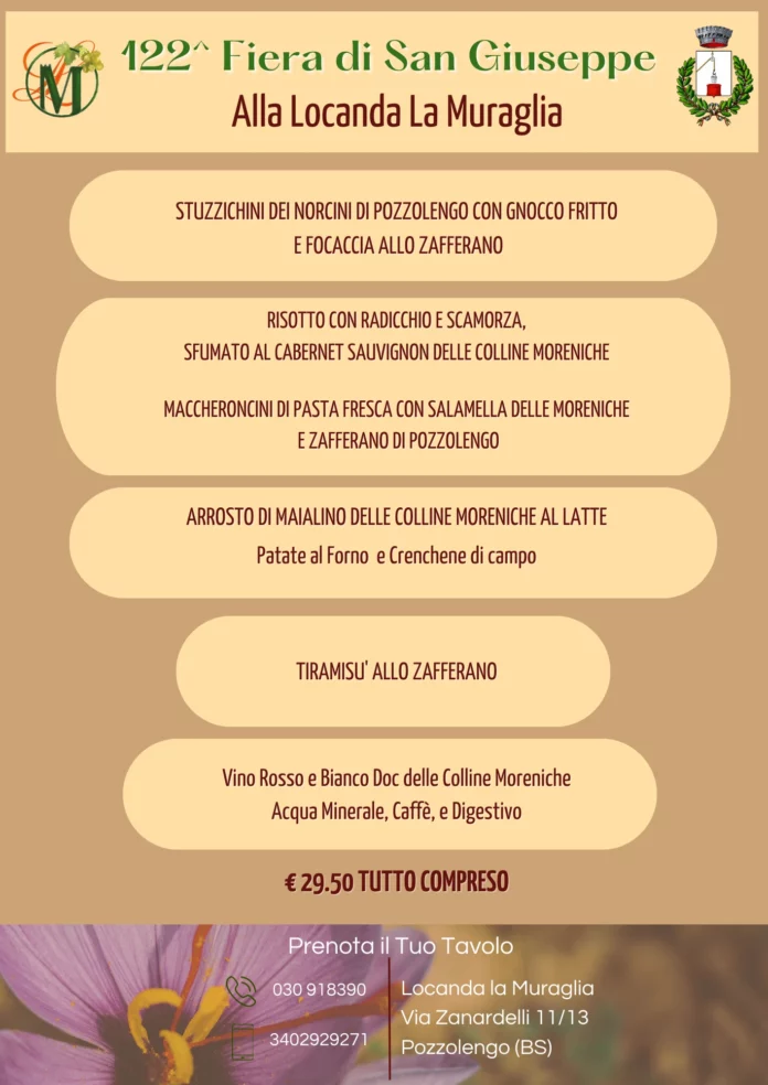 Pozzolengo – La Locanda la Muraglia, situata a Pozzolengo, propone un delizioso menù in occasione della 122^ fiera di San Giuseppe. Questo evento tradizionale attira visitatori da tutto il territorio e offre l’opportunità di gustare specialità culinarie locali.