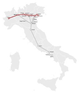 Approdando su questa linea Italo implementerà il proprio network garantendo nuovi collegamenti: lungo la trasversale Torino – Milano – Venezia ci saranno infatti anche le fermate intermedie di Brescia, Desenzano (servizio attivo a partire da Giugno 2018), Peschiera del Garda, Verona, Vicenza, Padova e Mestre, portando i suoi viaggiatori nel cuore delle città servite.