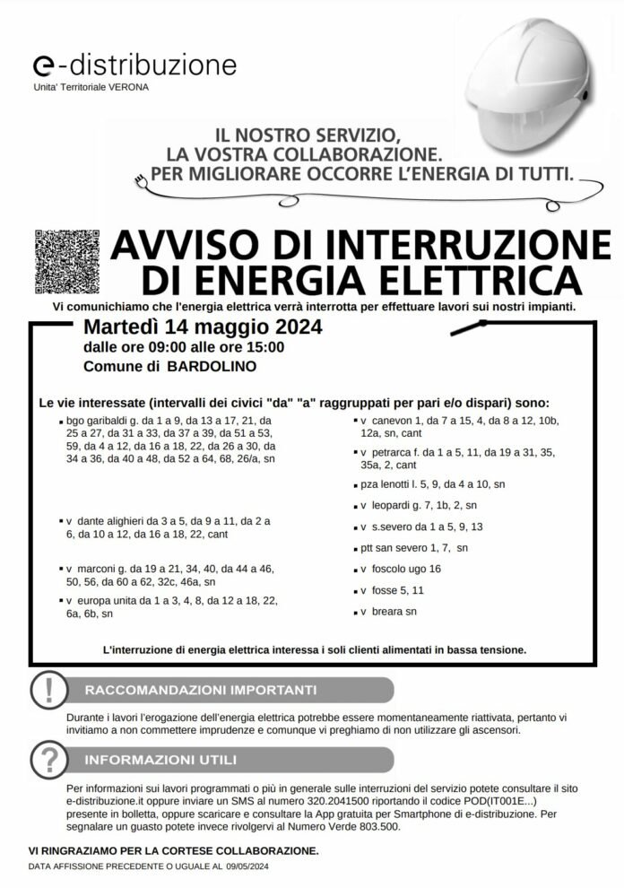 Il Comune di Bardolino sarà interessato da un’interruzione programmata del servizio elettrico, necessaria per lavori di manutenzione sugli impianti. L’interruzione è prevista per martedì 14 maggio 2024, dalle ore 09:00 alle ore 15:00.