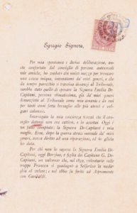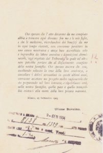 è passato più di un secolo dalla sua stesura. Ma sembrano millenni. è la normale storia di un uomo, tale Ulisse Borzino, che rimasto vedovo sposa la signora Emilia De Capitani, figlia del Capitano G. De Capitani, un volontario delle truppe francesi, al quale nel 1859 combattendo a Solferino fu assegnata una medaglia al valore. Nel 1860, con Garibaldi, fu ferito sull’Aspromonte. Ma il documento non riguarda una battaglie tra le due sopra citate, ma un’altra battaglia, forse ancor più dolorosa: una battaglia familiare. Anche se ai tempi nostri quanto successo allora farebbe sorridere.