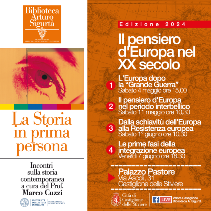 Nuova edizione de “La Storia in prima persona”, il ciclo di divulgazione storica a cura del Prof. Marco Cuzzi del Dipartimento di Studi Storici dell’Università degli Studi di Milano, promosso dall’Assessorato alla Cultura e la Biblioteca “Arturo Sigurtà” di Castiglione delle Stiviere, quest’anno dedicato alla storia contemporanea dell’Europa.