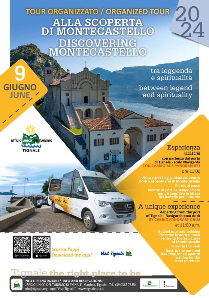 L’avventura inizia con un viaggio panoramico in Cabrio Bus, che parte dal porto di Tignale (scalo Navigarda). Una volta arrivati nel centro storico, i partecipanti saranno guidati in un trekking che li condurrà fino al suggestivo Santuario di Montecastello. Questa visita guidata non solo permetterà di scoprire le meraviglie architettoniche del Santuario, ma anche di immergersi nelle storie e nelle leggende che circondano questo luogo di grande spiritualità.