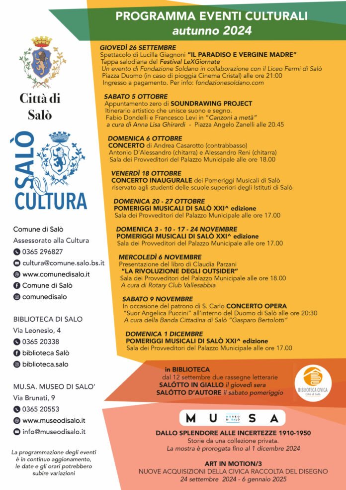 - 26 settembre 2024: L’autunno si apre con uno spettacolo teatrale d’eccezione. Nella splendida cornice di Piazza Duomo, Lucilla Giagnoni presenta “Il Paradiso e Vergine Madre”, tappa salodiana del Festival LeXGiornate. In collaborazione con il Liceo Fermi di Salò, lo spettacolo inizia alle 21:00. In caso di maltempo, l’evento si terrà presso il Cinema Cristal. Per informazioni sui biglietti, è possibile visitare il sito fondazionesoldano.com.