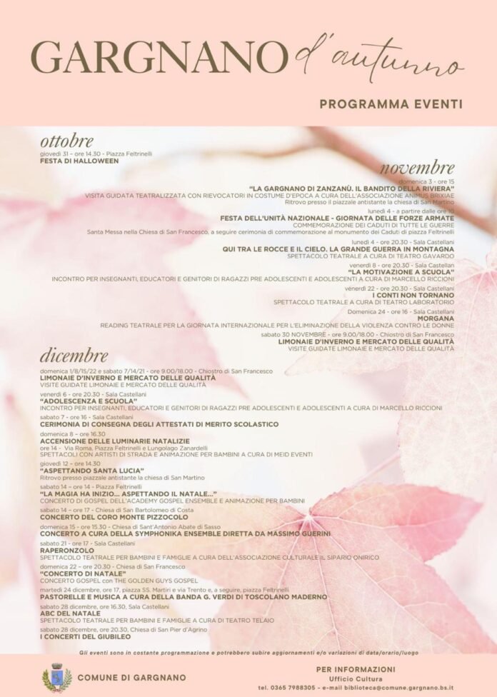 L’autunno a Gargnano si colora di eventi, un ricco calendario di appuntamenti che tra novembre e dicembre animeranno la vita culturale del comune gardesano. Organizzato dal Comune di Gargnano, il programma spazia da spettacoli teatrali e concerti a incontri formativi e visite guidate, con un occhio di riguardo per le famiglie e i più piccoli. Ecco i principali eventi in arrivo.