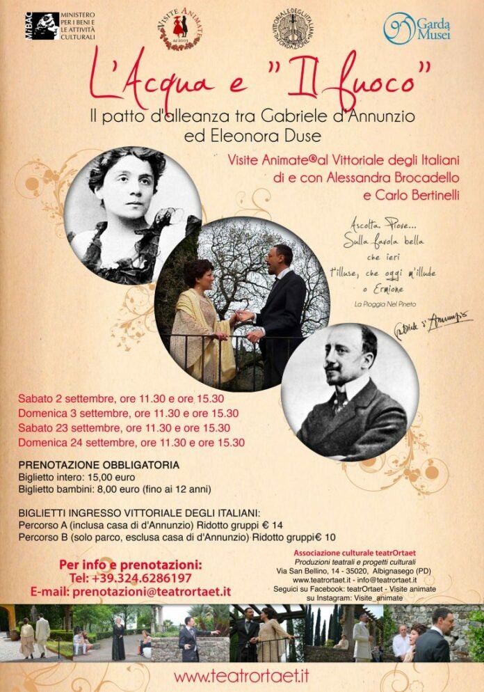 L’acqua e il fuoco, due elementi che rappresentano la trasparente limpidezza e l’indomabile ardore, sono al centro di un evento speciale che si terrà al Vittoriale degli Italiani sul lago di Garda. Le visite animate, organizzate in collaborazione con il Teatro Rtaet, ripropongono la suggestione e il fascino del “patto d’alleanza” tra due grandi personalità della cultura italiana: Gabriele d’Annunzio ed Eleonora Duse.