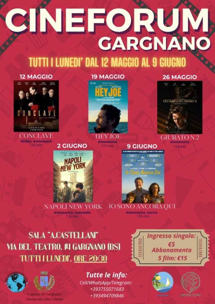 A Gargnano, presso la Sala “A. Castellani” in Via del Teatro 14, si terrà un cineforum con proiezioni ogni lunedì a partire dal 12 maggio fino al 9 giugno. La rassegna cinematografica prevede la proiezione di diversi film, tra cui “Conclave” il 12 maggio, un thriller drammatico della durata di 120 minuti; seguirà il 19 maggio “Hey Joe“, un drammatico di 117 minuti; il 26 maggio sarà proiettato “Giurato Numero 2“, un drammatico di 114 minuti. Nel mese di giugno, precisamente il 2, verrà mostrato “Napoli New York“, un film drammatico e commedia della durata di 126 minuti, e a concludere il ciclo, il 9 giugno, sarà la volta di “Io Sono Ancora Qui“, un drammatico storico di 135 minuti. Tutte le proiezioni avranno inizio alle ore 20:30.