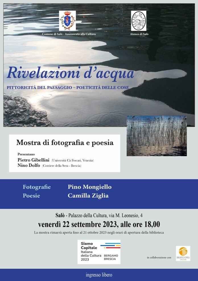 Il Salotto della Cultura di Salò ospiterà dal 22 settembre al 21 ottobre 2023 una mostra unica nel suo genere, intitolata “Rivelazioni d’Acqua: Pittoricità del paesaggio – Poeticità delle cose”. L’esposizione, curata da Pino Mongiello e Camilla Ziglia, unisce fotografia e poesia in un affascinante dialogo tra linguaggi artistici.