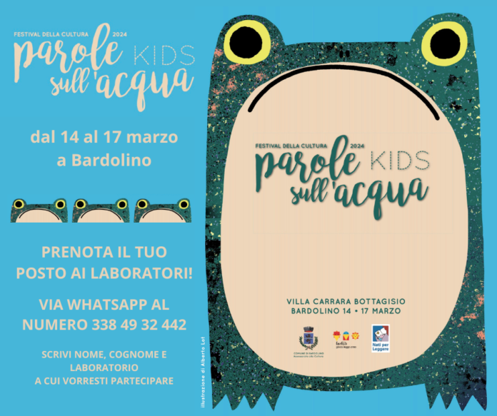 Il Comune di Bardolino si prepara ad accogliere l’edizione 2024 del “Parole sull’acqua kids”, il Festival della cultura rivolto ai bambini tra 0 e 6 anni e della scuola primaria. L’appuntamento, in programma dal 14 al 17 marzo, vedrà una simpatica rana, disegnata dall’illustratore Alberto Lot, come mascotte dell’evento.
