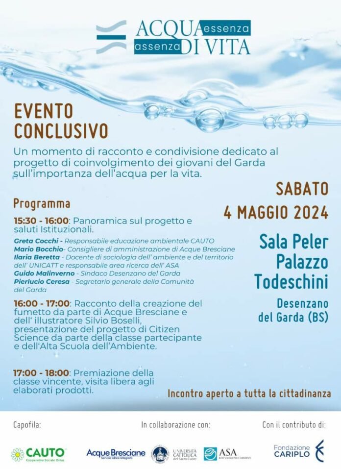 Sabato 4 maggio si terrà a Desenzano del Garda l’evento di chiusura del progetto ACQUA essenza assenza DI VITA, promosso dalla cooperativa CAUTO con il contributo della Fondazione Cariplo. L’obiettivo del progetto è aumentare la conoscenza e la consapevolezza dei ragazzi delle scuole primarie e secondarie di primo grado sulla sostenibilità ambientale e favorire la comprensione del loro ruolo nella transizione ecologica.