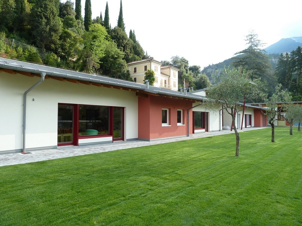 I vantaggi del legno sono consistenti e di tipo diverso: costruire in legno significa prima di tutto dare un contributo al rispetto dell’ambiente e alla sostenibilità, tanto più che in un edificio di questo tipo, una simile scelta svolge anche una funzione educativa e di sensibilizzazione «diretta» delle tematiche ambientali. Inoltre il legno ha una notevole capacità di isolamento, ma anche di assorbimento: è cioè in grado di compensare oscillazioni di clima e di umidità sul breve termine, creando un clima ambientale costante e più in generale una concreta percezione di comfort, anche per la naturale tendenza ad impedire l’ingresso di elettrosmog e di radiazioni ad alata frequenza, e per l’assenza di collanti e di sostanze chimiche. La cura dell’isolamento, l’orientamento a favore del massimo irraggiamento solare e l’attento dimensionamento di finestre e porte hanno permesso di installare una centrale termica di potenza ridotta.
