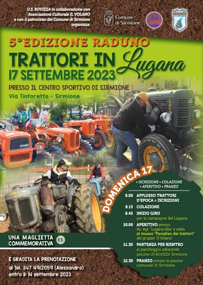 V.S. ROVZA, in collaborazione con l’Associazione Culturale Il Volano e con il patrocinio del Comune di Sirmione, vi invita a partecipare a un’entusiasmante giornata dedicata ai TRATTORI D’EPOCA che si terrà il 17 SETTEMBRE 2023 presso il CENTRO SPORTIVO DI SIRMIONE, situato in Via Tintoretto – Sirmione. Ecco il programma completo dell’evento: 8.00 – Registrazione e iscrizione, 8.15 – Colazione, 8.45 – Inizio del giro per le pittoresche campagne di Lugana, 10.00 – Aperitivo, 11.30 – Partenza per il rientro, 12.30 – Pranzo presso le piscine comunali di Sirmione.