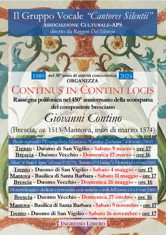 La rassegna di musica polifonica “Continus in Contini locis” celebra il 450° anniversario della scomparsa del compositore bresciano Giovanni Contino. Il Gruppo Vocale “Cantores Silentii”, nel suo 35° anno di fondazione, ha organizzato questa serie di otto concerti che si terranno in tre diverse città.
