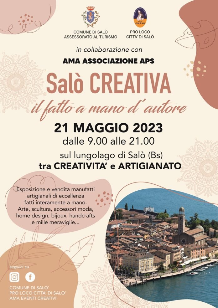 Il 21 maggio 2023, sul lungolago di Salò (Bs), si terrà la manifestazione Salò Creativa, organizzata dalla Pro Loco, dall’Assessorato al Turismo Città di Salò e dall’Associazione Ama APS. Si tratta di una vetrina di manufatti artigianali di eccellenza, realizzati interamente a mano da artisti e artigiani locali e non solo. Tra le proposte esposte e in vendita, si potranno ammirare opere di arte, scultura, accessori moda, home design, bijoux, handcrafts e mille altre meraviglie.