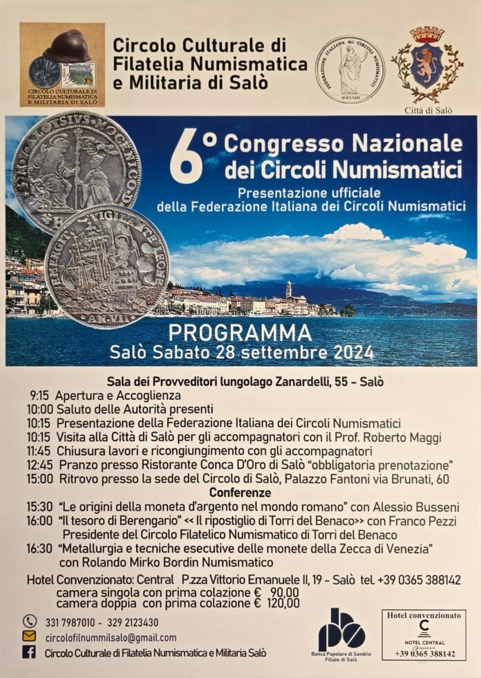 Il Circolo Culturale di Filatelia, Numismatica e Militaria di Salò ospiterà il 6° Congresso Nazionale dei Circoli Numismatici il 28 settembre 2024 presso la Sala dei Provveditori, sul lungolago Zanardelli a Salò. Si tratta di un incontro dedicato agli appassionati di numismatica, che vedrà la partecipazione di studiosi e collezionisti provenienti da diversi circoli italiani.