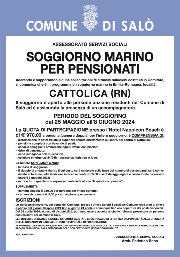 In risposta alle richieste provenienti da un gruppo di cittadini di Salò, l’Assessorato ai Servizi Sociali ha organizzato un soggiorno marino dedicato agli anziani residenti nel Comune. La destinazione scelta è la località di Cattolica in Emilia-Romagna, con soggiorno previsto dal 25 maggio all’8 giugno 2024.