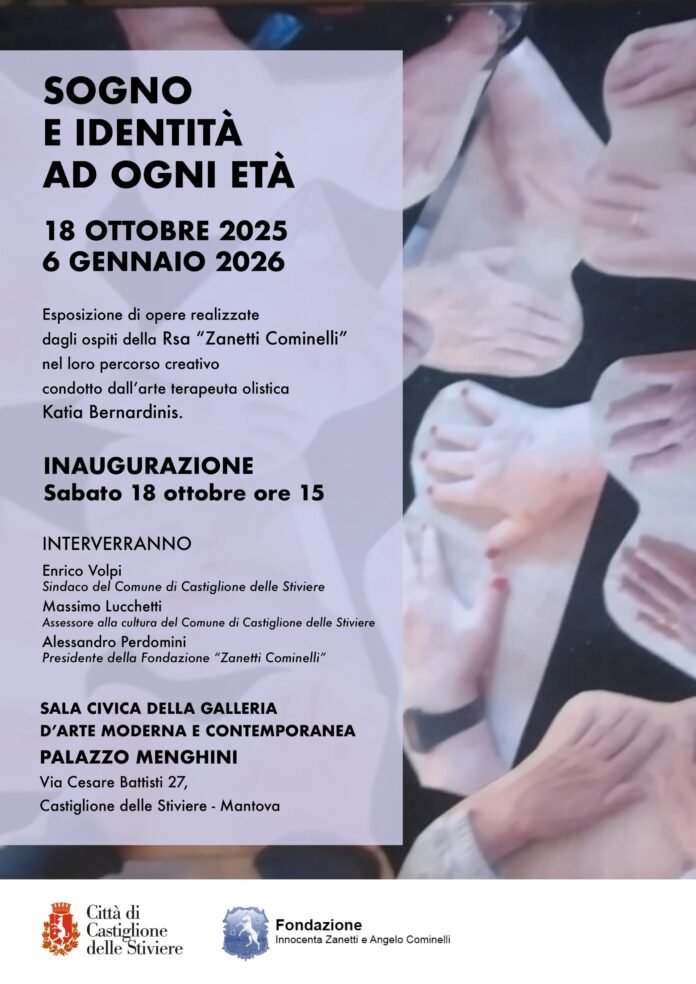 A Castiglione delle Stiviere, l’arte diventa uno strumento di espressione e identità per la terza età con la mostra “Sogno e identità ad ogni età”. L’esposizione, che sarà inaugurata sabato 18 ottobre a partire dalle ore 15:00 presso Palazzo Menghini, presenta le opere realizzate dagli ospiti della RSA “Zanetti Cominelli”. L’iniziativa nasce da un progetto di arteterapia che celebra la creatività e l’espressione personale in età matura, offrendo una nuova prospettiva artistica e sociale nel contesto del Lago di Garda.