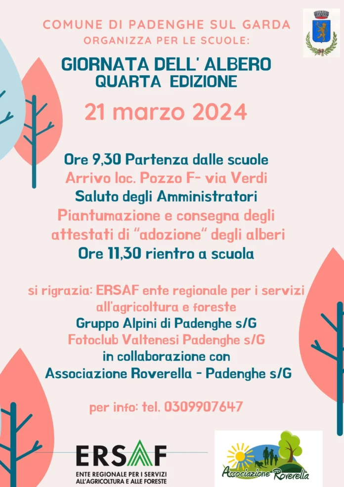 Il 21 marzo 2024, si terrà a Padenghe sul Garda la quarta edizione della “Giornata dell’Albero”, un evento organizzato dal Comune per le scuole locali. L’iniziativa coinvolgerà studenti di scuole primarie e secondarie di primo grado, partendo dalle 9:30 con un raduno presso la loc. Pozzo F- via Verdi. Dopo il saluto degli amministratori, ci sarà la piantumazione e la consegna degli attestati di “adozione” degli alberi. Il rientro a scuola è previsto per le 11:30. L’evento vede la collaborazione di ERSAF, il Gruppo Alpini di Padenghe sul Garda, il Fotoclub Valtenesi Padenghe sul Garda e l’Associazione Roverella – Padenghe sul Garda. Per maggiori informazioni, è possibile contattare il numero 03509907647 o visitare il sito del Comune di Padenghe sul Garda.